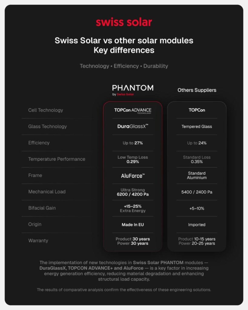 Over a three-year development period, Swiss Solar engineers evaluated multiple cell architectures, materials, and structural solutions, selecting only those technologies that demonstrated consistent advantages under real operating conditions.